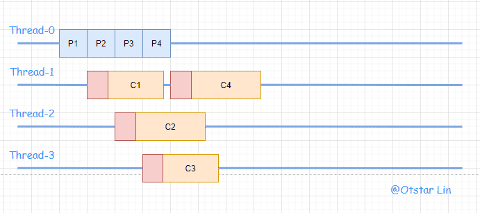 ExecuteProduceConsume:这种模式比较特殊,该模式和 ProduceConsume 类似,都是生产消费都在一个线程里完成,这样就可以充分的利用热缓存。但与其不同的是,该模式可能会新建一个新线程以继续生产和执行任务,线程不应该生产自己不想消费的任务,而应该把生产和消费职责都转移到另一个进程中执行。虽然这个可以很好的利用热缓存,但是同时也带来一个问题:一旦 IO 的消费时间过长,就会导致大量的阻塞。